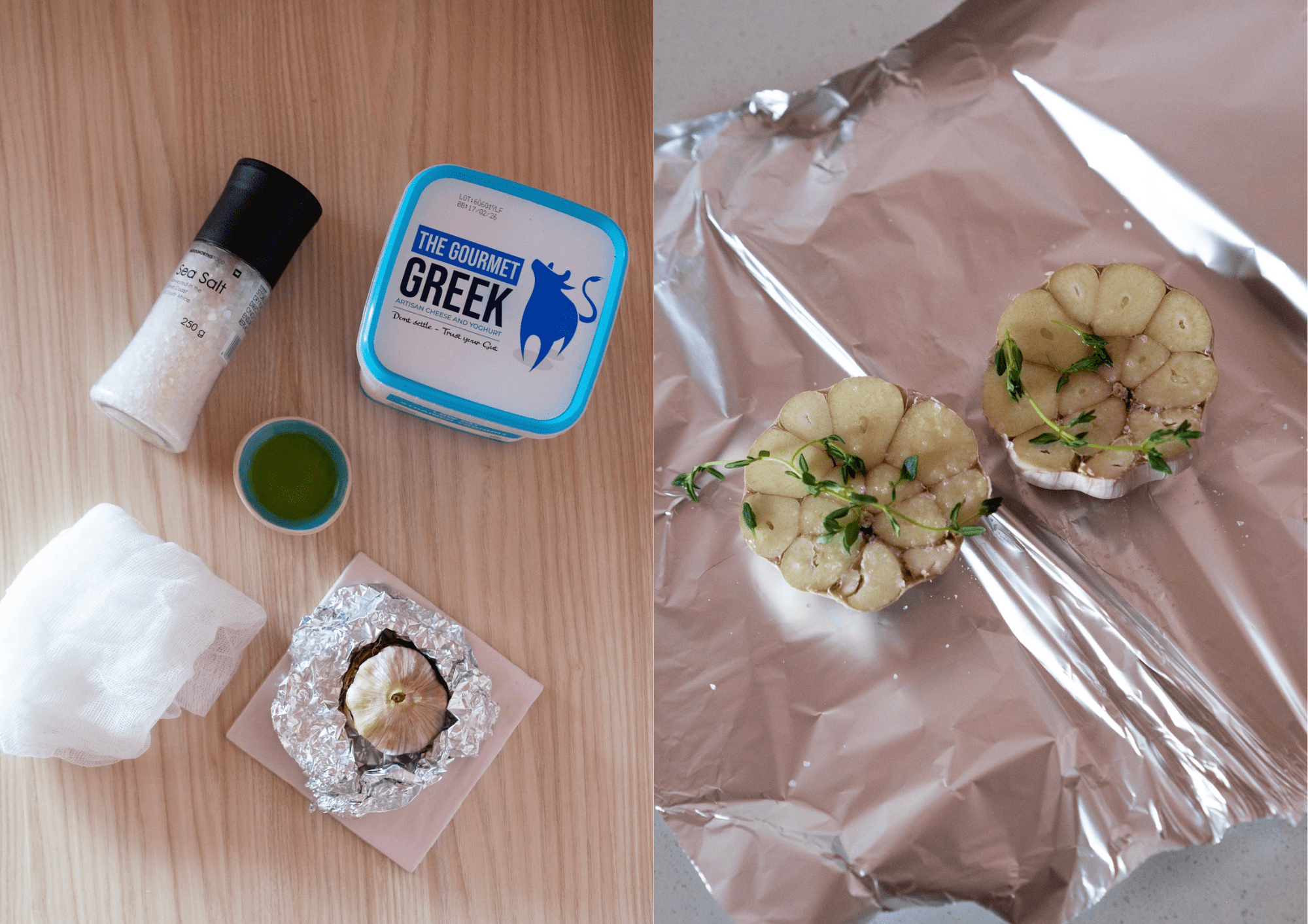 While the yoghurt strains, bake the garlic. Slice the garlic head in half, season with salt, pepper, herbs and olive oil, then wrap it in foil and roast until soft and golden. Once cooled, squeeze out the buttery garlic flesh and stir it into the labneh until fully combined.